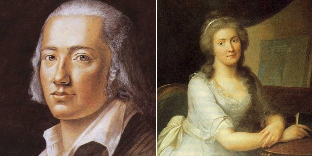 Links: Friedrich Hölderlin, Pastell von Franz Karl Hiemer, 1792. Rechts: Charlotte von Kalb, gemalt von Johann Heinrich Schmidt, 1785.