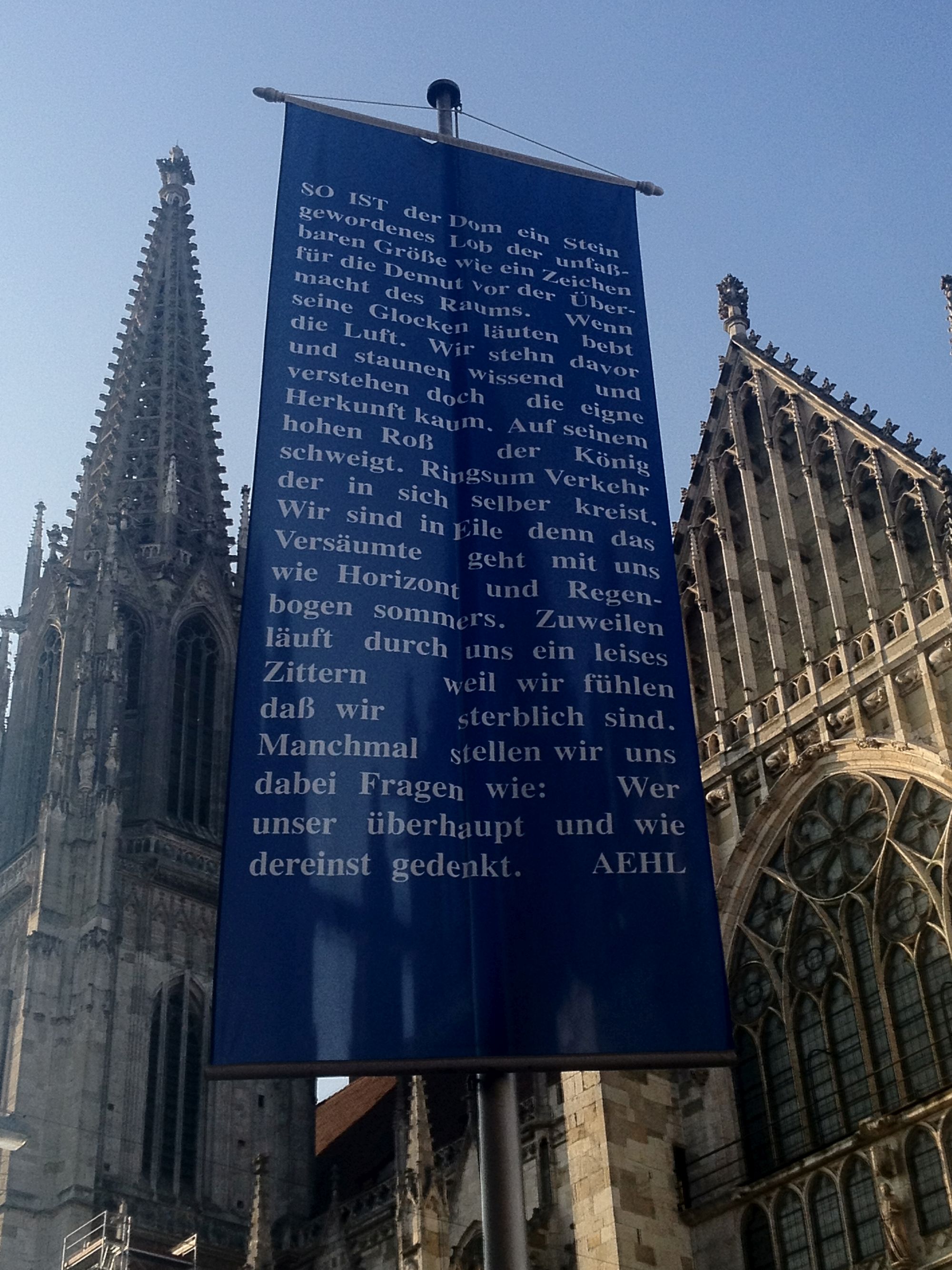 Ein Fahnengedicht von Andreas Ehl vor dem Regensburger Dom © Andreas Ehl