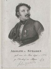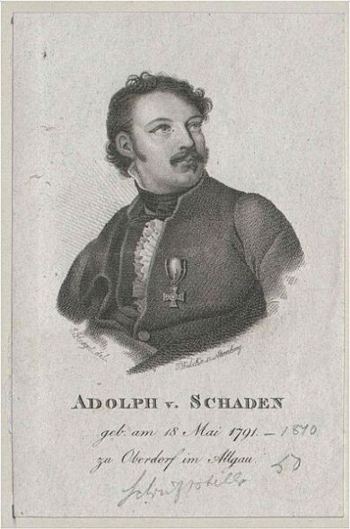 Adolph von Schaden, 1791 in Oberdorf im Ostallgäu geboren, ist nach seinem Ausscheiden aus dem Militärdienst schriftstellerisch tätig. Er verfasst Dramen, Trauer- und Lustspiele, Romane, Erzählungen, Reisehandbücher und historische Werke. Eine Anerkennung vonseiten der Literaturkritik bleibt ihm versagt. 1840 stirbt er in München.