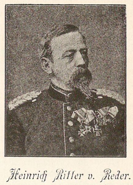 Heinrich von Reder, Sohn eines königlichen Gerichtsarztes aus Mellrichstadt, geht in Schweinfurt und Aschaffenburg zur Schule, bevor er an der Forstakademie Aschaffenburg und an der Universität München studiert. 1848 wird Reder Offizier im ersten Artillerieregiment, als solcher nimmt er am Deutschen Krieg von 1866 und am Deutsch-Französischen Krieg von 1870/71 teil. In München, Lindau, Ingolstadt, Germersheim, Landau, Würzburg und anderen deutschen Städten bezieht er Garnison. Für seine Verdienste wird er mit dem Militär-Max-Joseph-Orden ausgezeichnet und in den Adels- und Ritterstand erhoben. 1881 scheidet er als Oberst aus dem aktiven Militärdienst aus. Seitdem lebt er in München. 1906 wird er zum Generalmajor befördert.