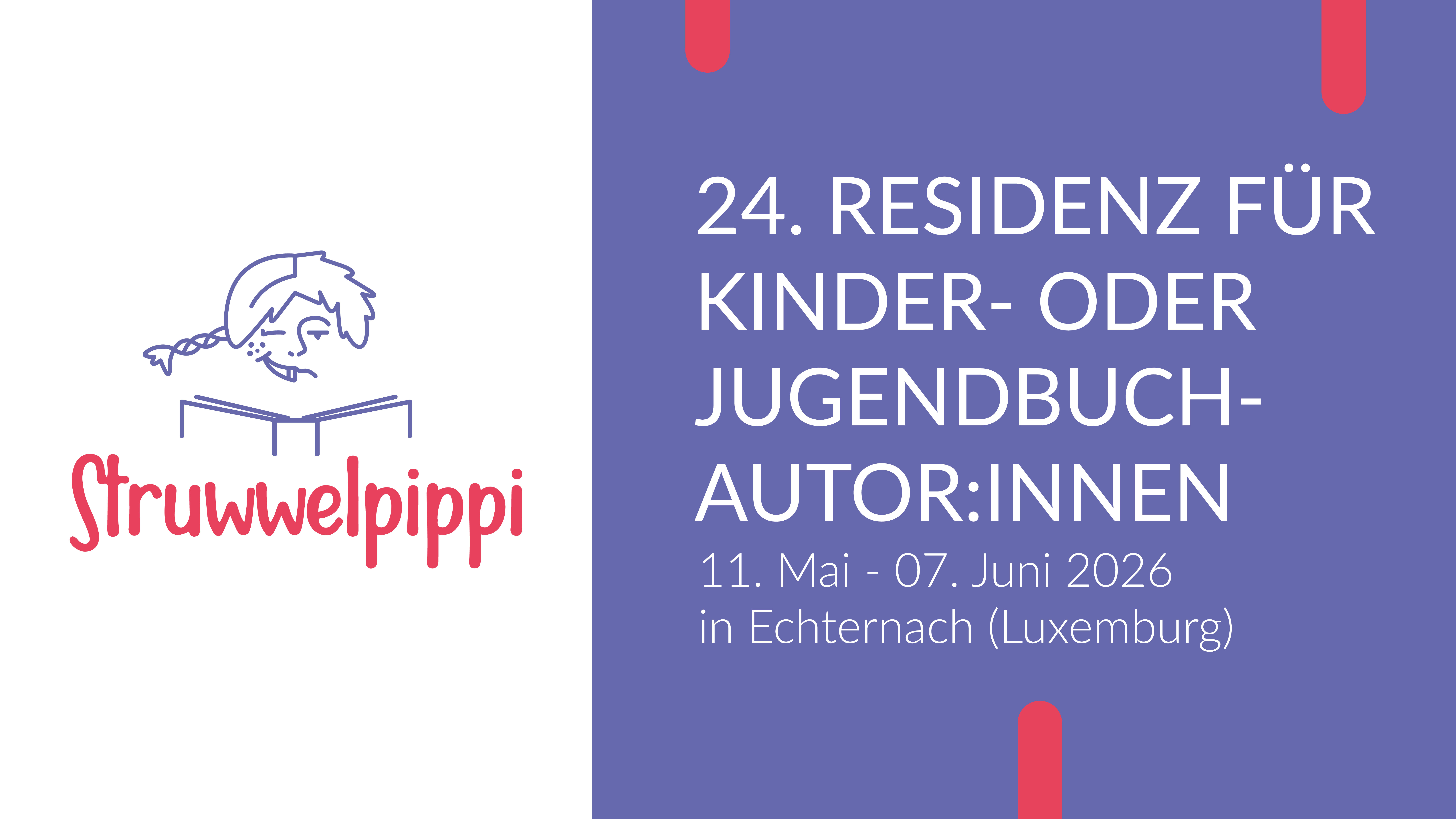 Die Struwwelpippi-Autor:innenresidenz wird 2026 zum 24. Mal von der Stadt Echternach und dem TRIFOLION Echternach in Zusammenarbeit mit dem Kulturministerium Luxemburg ausgeschrieben. Gesucht wird eine deutschsprachige Kinder- oder Jugendbuchautorin / ein deutschsprachiger Kinder- oder Jugendbuchautor. Die Schreibresidenz wird zwischen dem 11. Mai und dem 7. Juni 2026 stattfinden. Bewerbungen werden bis zum 13. Dezember 2025 entgegengenommen.