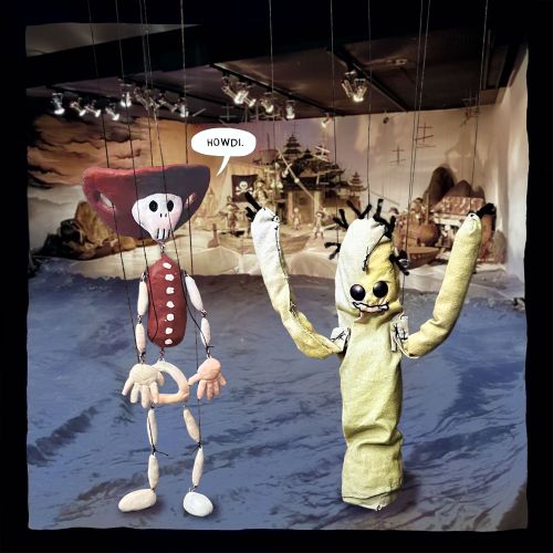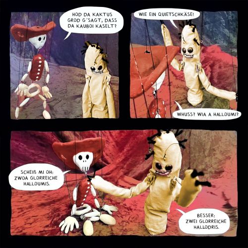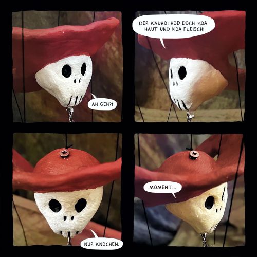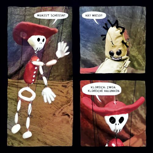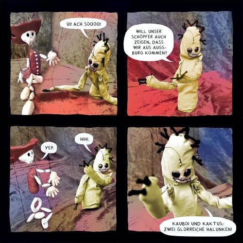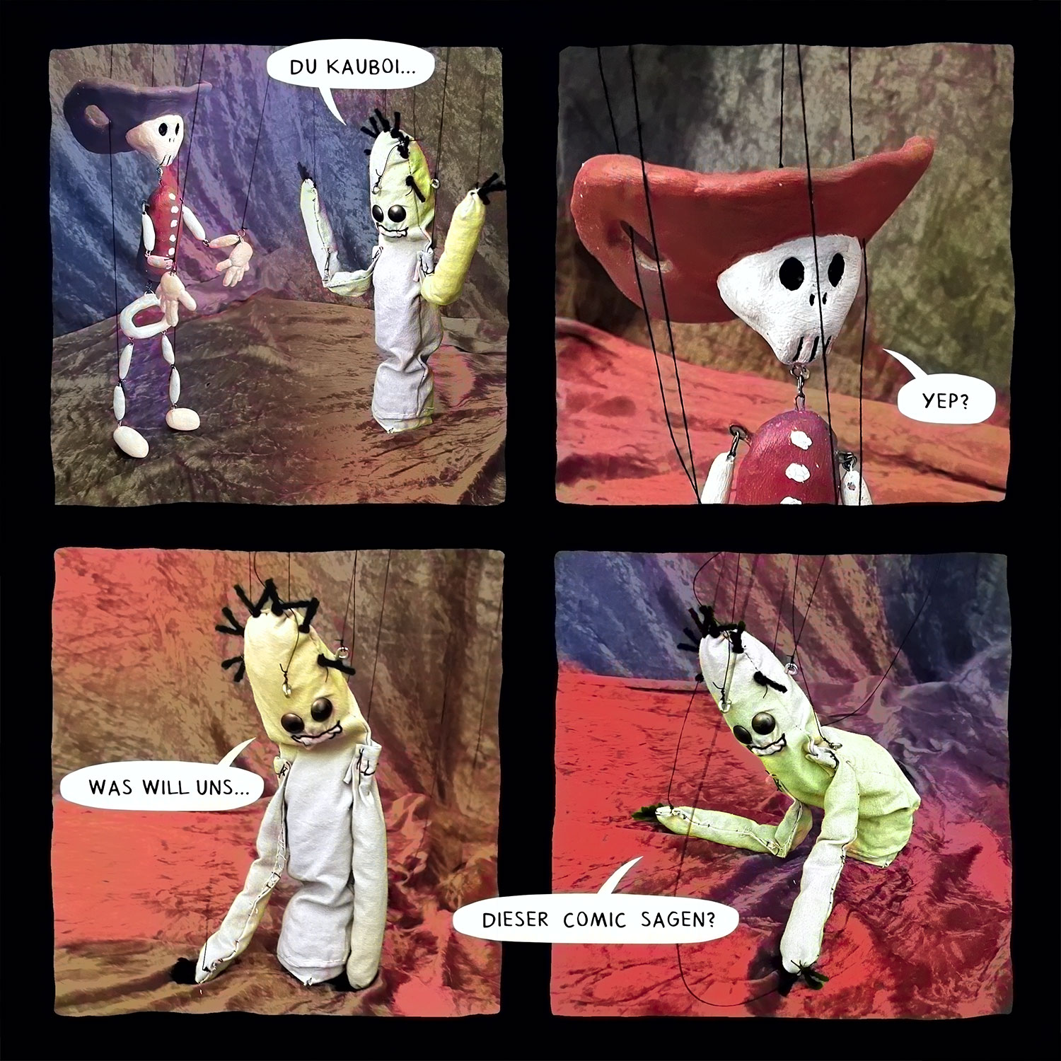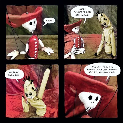 Comiczeichnen ist ein schöner Beruf. Doch reich wird man davon leider nicht. Es gibt Ausnahmen, ich bin keine. Ich verdiene mein Geld hauptsächlich als Ausbilder in der Gestalterwerkstatt der Fachoberschule in Augsburg. Das Gute daran ist, dass es mir großen Spaß macht, jungen Leuten „was mit Kunst“ beizubringen. Einige Schülerinnen und Schüler absolvieren ihre fachpraktische Ausbildung in der Augsburger Puppenkiste, kommen jedoch am Montag zu mir in die Werkstatt, da die Puppenkiste am Montag geschlossen ist. Dann dürfen sie auch bei mir Marionetten bauen. Und so kam es, dass ich den nachfolgenden Comic mit Figuren anfertigen konnte, die im Dunstkreis der legendären Puppenkiste entstanden sind. Credits gehen hiermit raus an meine talentierten Nachwuchskreativen Dina Hübler, Seraphina Peschl und Emil Zogg sowie an meine Tochter Antonia, die als Puppenspielerin mitgewirkt hat.