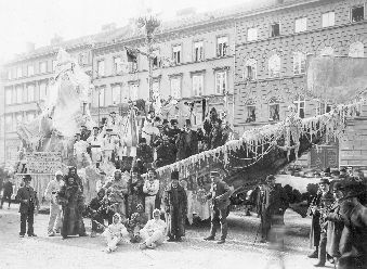 Links: Bauernkirchweih, um 1910 (Verlag und Bildarchiv Sebastian Winkler). Mitte: Ödön von Horváth mit Freunden im Fasching, 1928 (Monacensia München). Rechts: Maskenzug Motto „Nordpolfahrt“, 1897 (Monacensia München).
