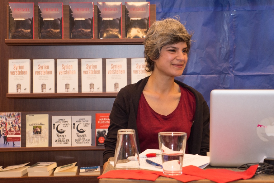 Björn Bicker stellte die richtigen Fragen nach Herkunft, Ausbildung, Leben als Frau in Damaskus, den Gründen Damaskus zu verlassen. Der Zwischenstation Ungarn. Und nach der Ankunft in München. Wie ist es, hier zu sein.
