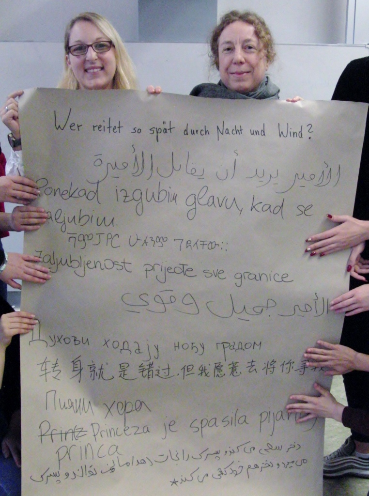 Die Jugendlichen haben Bildschätze erkundet, die in ihren Muttersprachen schlummern und im Deutschen eine neue Strahlkraft entfalten. Sie haben rhythmischen Besonderheiten unterschiedlicher Sprachen nachgelauscht, sich mit Poesie der großen deutschen Tradition beschäftigt (etwa Goethe) und sich auf die Herausforderung phantasievollen Übersetzens eingelassen. Entstanden sind sehr bewegende Zeugnisse, etwa dieses: