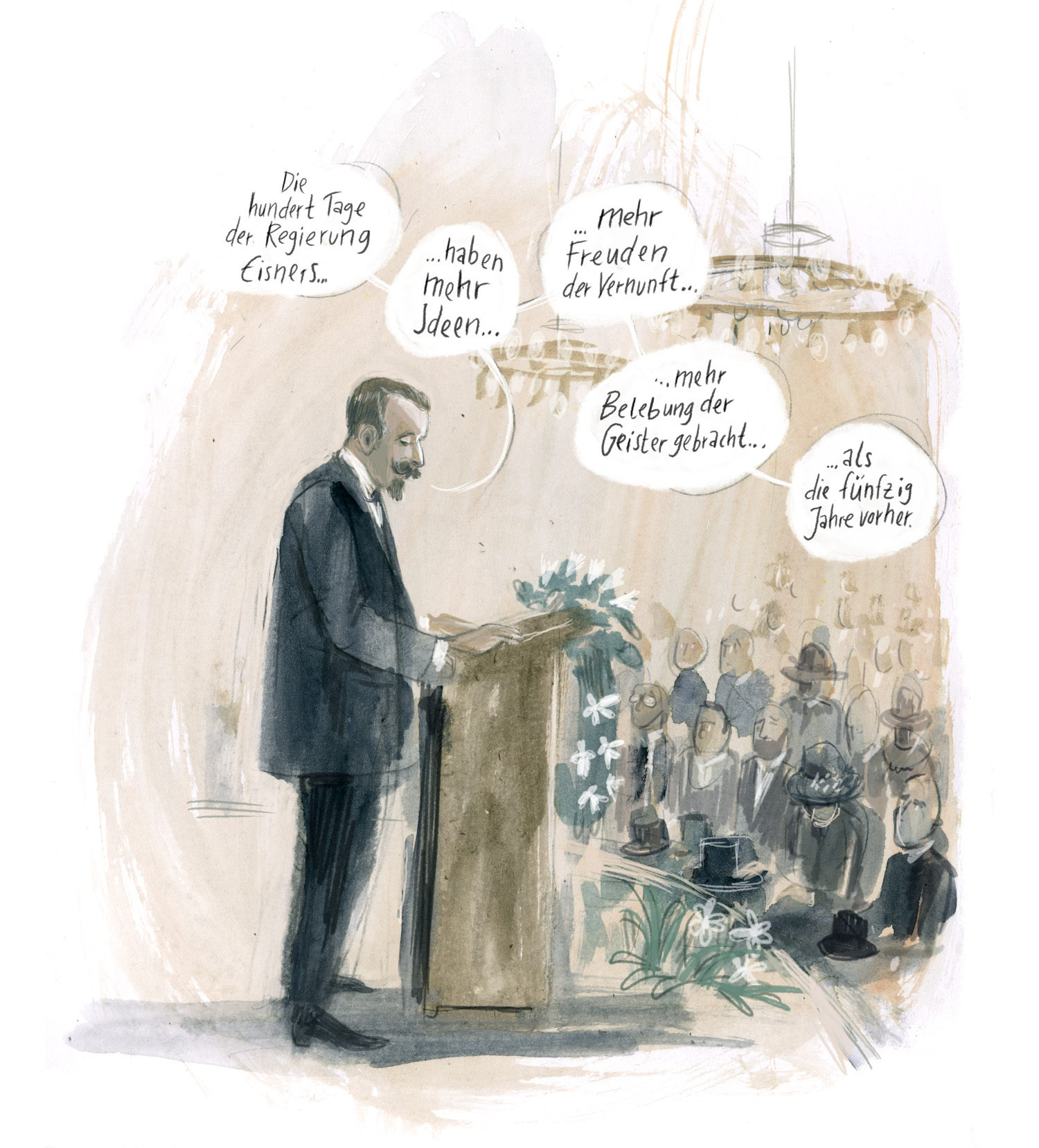 Im November 1918 hatte er sich dem neu ausgerufenen Freistaat Bayern als provisorischer Ministerpräsident zur Verfügung gestellt – voller Hoffnung auf den Wandel der Gesellschaft hin zu einem menschlichen und gerechten Zusammenleben. Doch nach der mehr als deutlichen Niederlage bei den ersten Landtagswahlen im Januar 1919 muss er enttäuscht einsehen: Bayern ist noch nicht so weit. Klar ist für ihn als Verfechter des demokratischen Systems, dass er daraus Konsequenzen ziehen muss. Ohne die Legitimation durch die Wahlen kann und will er nicht weiter regieren. Mit dem Verfassen der Rücktrittserklärung zieht er Bilanz über seine hundert Tage als Ministerpräsident: Gelungen war seiner Regierung die Lösung von drängenden Problemen, aber auch die Umsetzung einiger langjähriger Ziele der Sozialdemokratie, wie die Einführung des Achtstundentages oder die Aufhebung der kirchlichen Schulaufsicht. Auch ein Entwurf für eine neue Verfassung war erarbeitet. Als nicht erreicht verbucht Eisner seine Ziele in der Außenpolitik und in der Frage nach der zukünftigen Verankerung der Räte in der Demokratie.