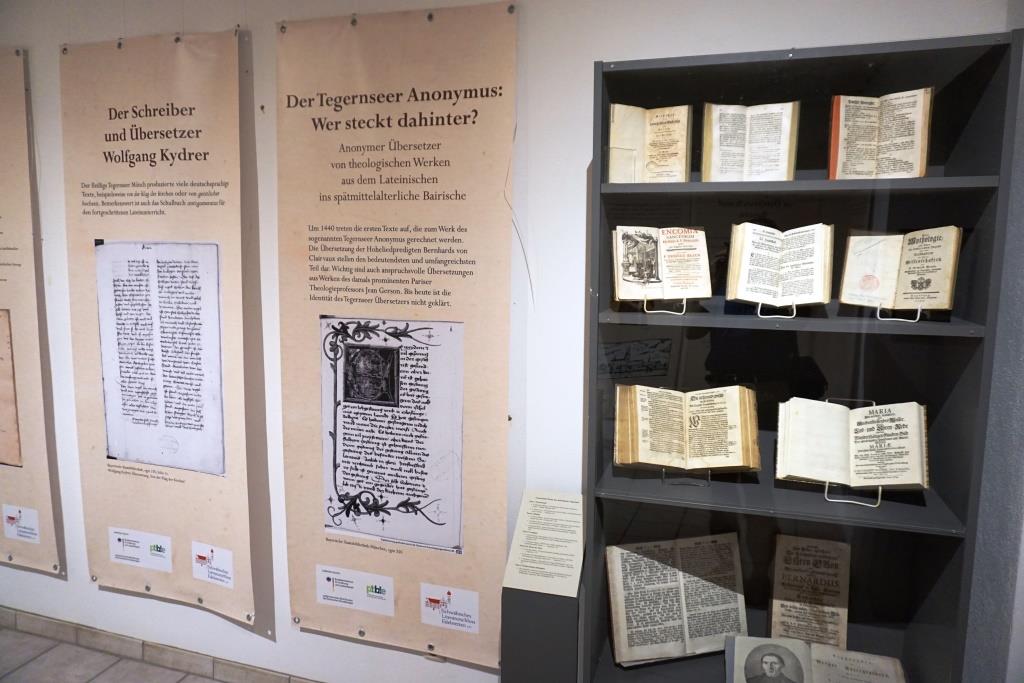 Dass Tegernsee als „literarischer Thinktank des Spätmittelalters“ gedacht werden kann, zeigt gleich der erste Ausstellungsraum am Eingang. Auf mehreren rund um den Raum aufgehängten Schaufahnen wird auf das „Gelehrte Tegernsee“, seine „Netzwerke“ in Österreich und Bayern, die „Elitäre theologische Debattenkultur“, die „Gedächtniskunst“ und die liturgische Literatur („Hymnen für die Klosterschule“, „Tegernseer Vaterunser“) hingewiesen. Die Tegernseer Mönche diskutierten z.B. verschiedene Übersetzungsmöglichkeiten des pater noster, um den Laien den richtigen Wortlaut vorzugeben, den sie beten sollten. Der Tegernseer Mönch Johannes Keck, der zusammen mit dem Schreiber und Übersetzer Wolfgang Kydrer vorgestellt wird, nimmt dabei eine besondere Stellung ein. Aber auch dem „Tegernseer Anonymus“, einem anonymen Übersetzer von theologischen Werken aus dem Lateinischen ins spätmittelalterliche Bairische, wird in der Ausstellung nachgegangen. Wichtig sind dessen Übertragungen der Hoheliedpredigten Bernhards von Clairvaux und des prominenten Pariser Theologieprofessors Jean Gerson.