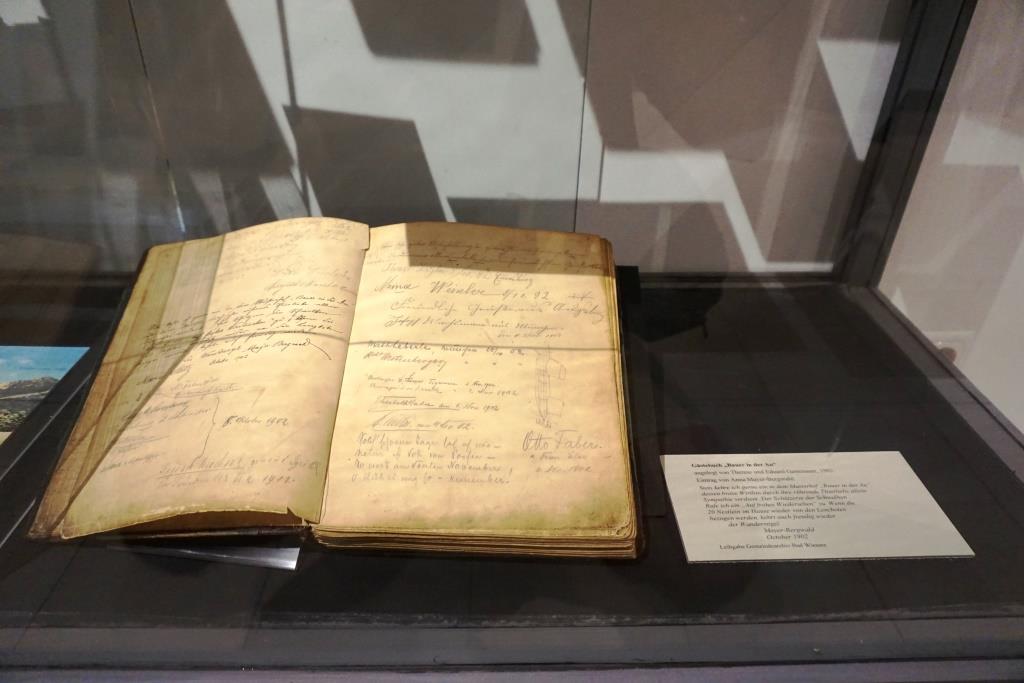 Die Ausstellung hält so manche literarische Entdeckungen für die Besucher*innen bereit. So zum Beispiel einen Eintrag der Schriftstellerin Anna Mayer-Bergwald (1852-1935) ins Gästebuch Bauer in der Au von 1902, einer Leihgabe des Gemeindearchivs Bad Wiessee, das zum ersten Mal für die breite Öffentlichkeit hier ausgestellt wird: