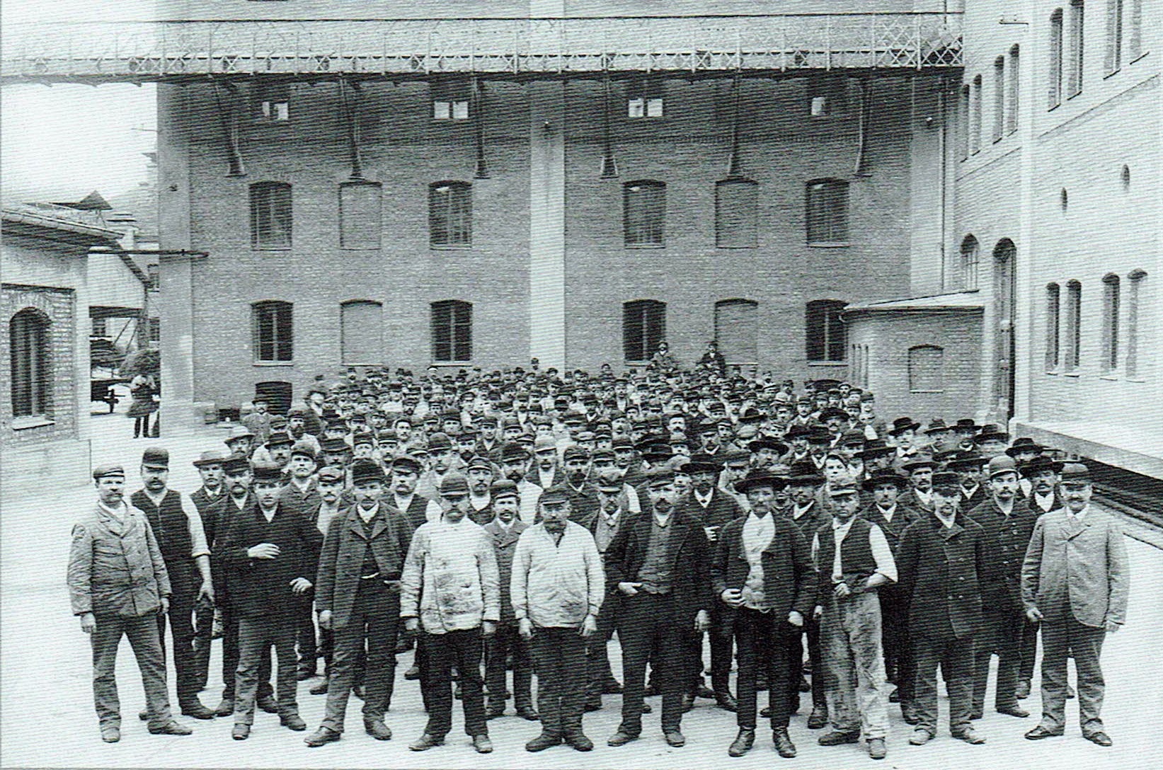 Belegschaft der Augustinerbrauerei um 1890 im Innenhof an der Landsberger Straße