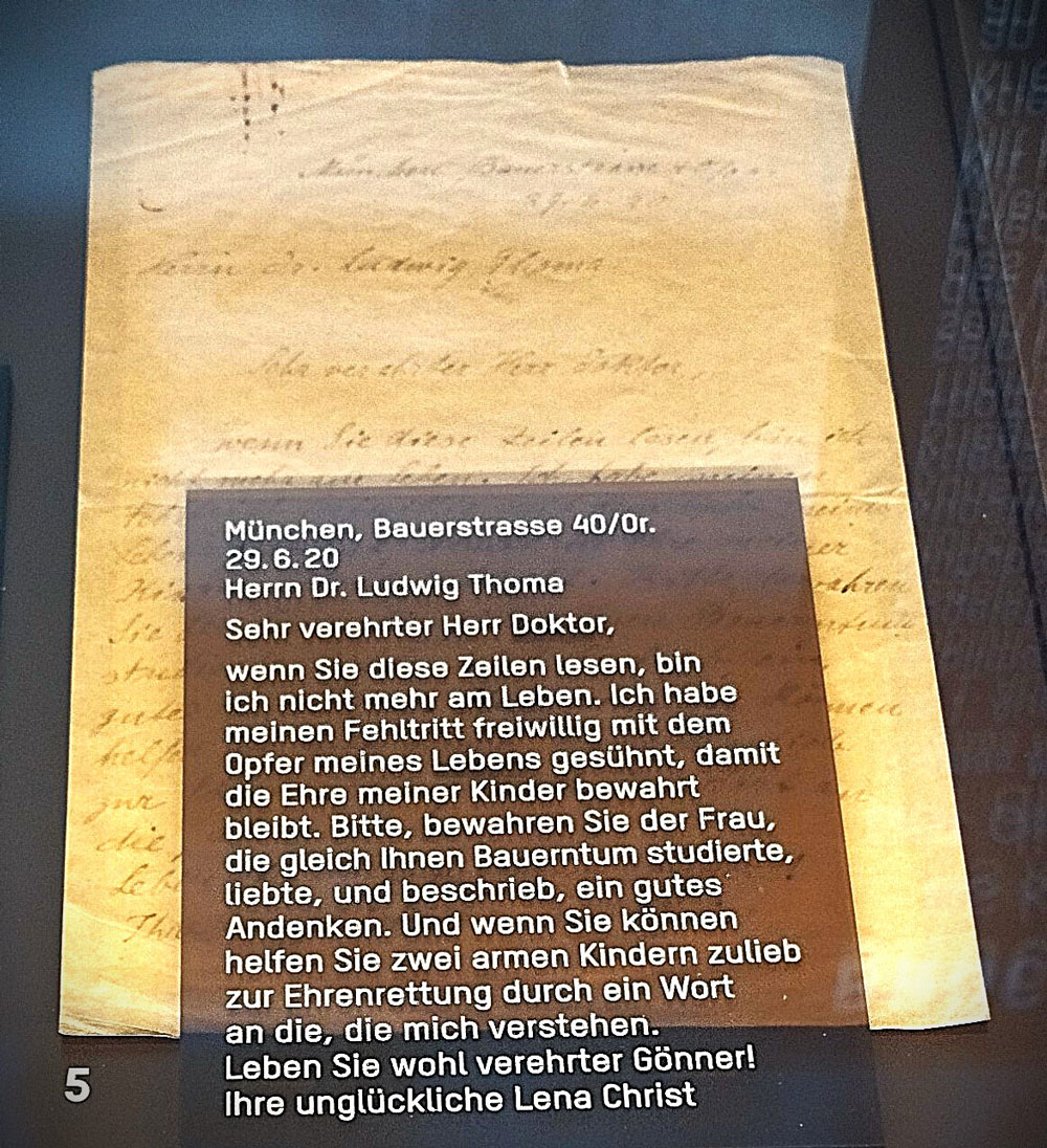 Lena Christ, bayerische Schriftstellerin des frühen 20. Jahrhunderts, heiratete einen gewalttätigen Alkoholiker, um ihrer grausamen Mutter zu entkommen. Glücklicherweise konnte sie ihn verlassen, hatte aber drei Kinder zu versorgen. Ohne Ausbildung und emotionale Unterstützung durch ihre Angehörigen gelang es ihr dennoch, Schriftstellerin zu werden. Aber trotz des relativen Erfolgs ihrer Bücher und sogar der Auszeichnung mit dem König-Ludwigs-Kreuz lebte sie in Armut und beging ein Verbrechen – sie fälschte die Signaturen von Gemälden. Die bevorstehende Anklage und der drohende Prozess waren letztlich der Auslöser: 1920 nahm sich Lena Christ das Leben. In der Ausstellung „Literarisches München zur Zeit von Thomas Mann“ in der Monacensia liegt in einer Vitrine neben ihrem Foto ihr Abschiedsbrief.