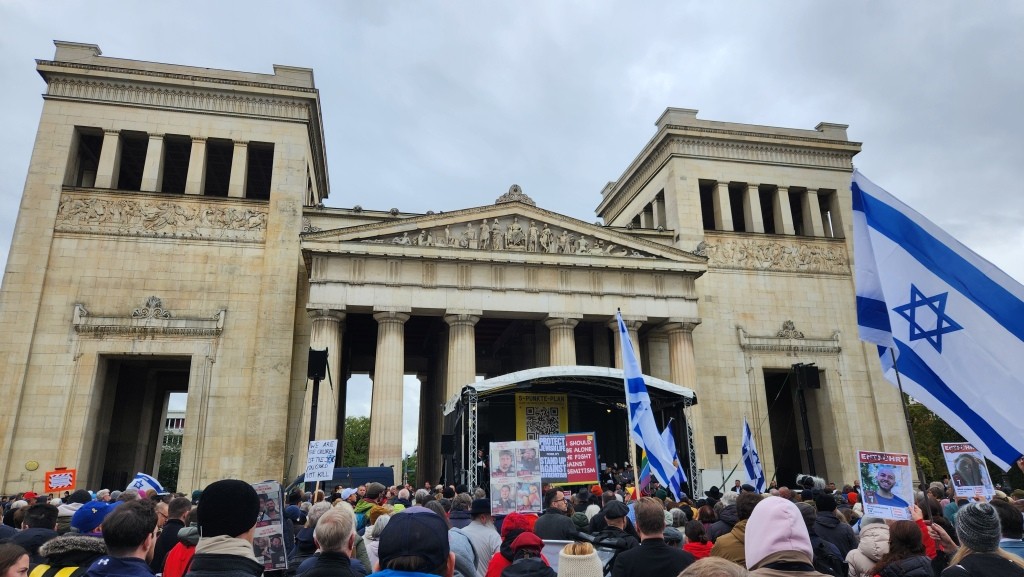 GUY KATZ: Trotz widriger Umstände – schlechtes Wetter, langes Wochenende, letzter Wiesn-Tag – haben sich am Sonntag mehrere Tausend Menschen auf dem Königsplatz versammelt, um gemeinsam ein sichtbares Zeichen gegen Antisemitismus zu setzen. Besonders berührt hat mich, dass sich viele aus ganz Deutschland, Österreich und der Schweiz auf den Weg gemacht haben, teils nach stundenlanger Anreise.