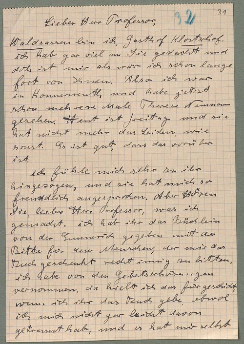 Fasziniert von „der Resl“ hielt Emmy ihre Eindrücke tagebuchartig fest, mit dem Ziel sie für eine spätere Veröffentlichung aufzubereiten. Hugo Ball hatte Not, Emmys Eifer zu bändigen. Er sandte seiner Frau briefliche Anweisungen zur Recherche nach biographischen und gesundheitlichen Fakten. Emmy antwortet ihm mit enthusiastischen Schilderungen ihrer ergreifenden Begegnungen mit der Leidenden. Diese farbigen Erzählungen beseelter Gotteserfahrung beleben ihre beiden an Muth gerichteten Schreiben vom 31. Mai und 3. Juni aus Waldsassen.