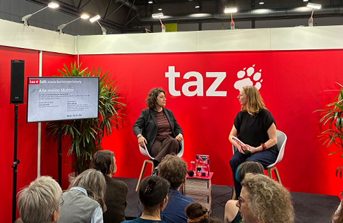 Eine Halle weiter hat die tageszeitung ihren Stand. Auch hier reichen die Sitz- und Stehplätze für das andrängende Publikum nicht aus. Für Passanten bleibt nur ein schmaler Pfad offen. Auf der Bühne nehmen meine Kollegin, die Schriftstellerin Lena Gorelik, und Doris Akrap Platz. Gorelik präsentiert ihr eben erschienenes Buch Alle meine Mütter. Der vorgesehene Slot von einer halben Stunde lässt für die Lesung aus dem Buch nur etwa drei Minuten Zeit. Der Rest ist Gespräch.