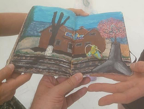 Die Dichterin erzählte mir, dass auch ihre beiden Wohnungen, d.h. ihre und die ihres Mannes, sowie das schneeweiße Hotel, in dem wir übernachtet hatten, und der Nachtclub „Santa Barbara“, der zuerst in meinem Text und dann auch auf dem Bild im blauen Moleskine-Notizbuch auftauchte, zerstört worden waren.