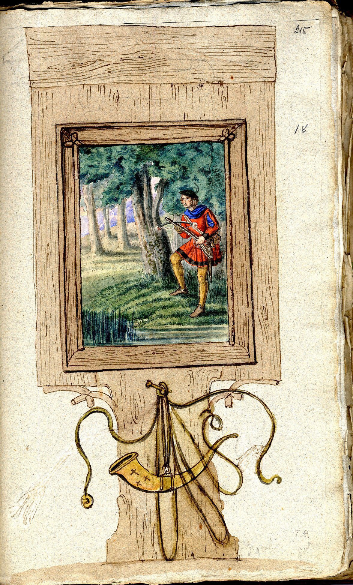 Die aquarellierte Federzeichnung Poccis zeigt eine Waldszene. Auf einem Holzschild mit Standfuß ist ein gerahmtes Bild befestigt, es stellt einen Jäger in idealisierender mittelalterlicher Gewandung mit einer Armbrust dar. Am Fuß hängt ein Waldhorn mit Tragriemen an einem Nagel.