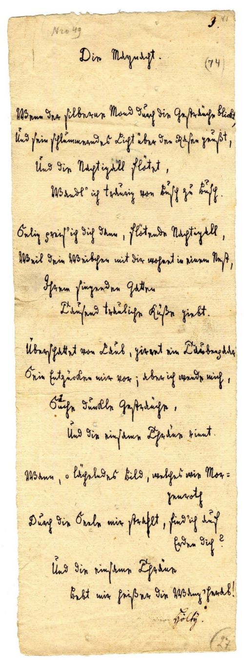 1867 erwarb die Bayerische Staatsbibliothek den Nachlass von Johann Heinrich Voß (1751-1826), die sogenannten Vossiana, aus Familienbesitz. Der Bestand umfasst zahlreiche Manuskripte von Voß, unter anderem seine berühmte Homerübersetzung sowie umfangreiche Korrespondenzen. In diesem Nachlass befanden sich auch viele fremde Manuskripte besonders von seinen Dichterkollegen aus dem Göttinger Hainbund, etwa von Friedrich Leopold Graf zu Stolberg (1750-1819), Heinrich Christian Boie (1744-1806) oder Ernst Theodor Johann Brückner (1746-1805). Am bedeutendsten sind dabei drei umfangreiche Konvolute mit Manuskripten und Briefen von Ludwig Heinrich Christoph Hölty (1748-1776), dem bekanntesten Vertreter des Göttinger Hainbundes, die aus den Vossiana herausgelöst und unter den Signaturen Cgm 5194a und b sowie Cgm 5195 aufgestellt wurden. Nach Höltys frühem Tod im Alter von nur 27 Jahren waren die Manuskripte zunächst an seinen Freund Heinrich Christian Boie gegangen, den Hölty kurz vor seinem Tod zum Herausgeber seiner Werke bestimmt hatte, und 1780 an Voß, der dann schließlich zusammen mit Stolberg 1783 die erste Ausgabe der Gedichte Höltys besorgte.