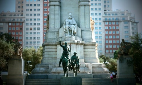 Wesentlich größer fiel das faszinierende Denkmal in der Hauptstadt aus, das 1926 auf der Plaza Espanya errichtet wurde – obwohl der Dichter hier eher grimmig auf seine Figuren schaut.