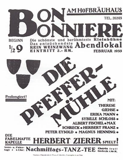 Als erste Gründerin und Leiterin eines politischen Kabaretts begann Erika Mann mit der „Pfeffermühle“ wie einst mit dem „Laienbund deutscher Mimiker“ (Station 4) an einem Neujahrstag, diesmal dem 1. Januar 1933 in der „Bonbonnière“ an der Neuturmstraße 5. Zum Ensemble gehörte auch Erika Manns Freundin Therese Giehse.