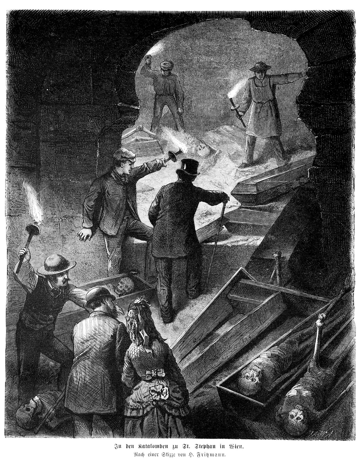 „In gewissen Abständen, gleichsam symmetrisch geordnet, stecken zwischen ihnen [den aufgestapelten Knochen, Anm. d. Red.] die Köpfe, aber auch auf der Erde liegen bereits Trümmer herum, und der weiche Tritt läßt merken, daß man auf Moder gehe. Ein Führer bedeutete uns, daß man die vielfach zerstreuten Knochen der Katakomben und die einst auf dem Stephansfriedhofe ausgegrabenen hier der Ordnung wegen aufgeschichtet habe.“