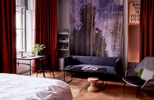 Neben den öffentlichen Räumen befinden sich die 30 Hotelzimmer, ehemalige Büros der Bankvorstände, schalldicht und für jedermann buchbar, wenn auch nicht ganz billig. Dafür bieten die Zimmer gutes Design bis ins Detail, etwa jeweils mit einer eigenen Auswahl von Zeitschriften und Büchern aus dem Buch-Café Lost Weekend in der Schellingstraße. Der dritte Stock, sozusagen Herzstück des Hotels, wartet mit vier Bars, zwei Studios, die für Veranstaltungen gemietet werden können, und einer Terrasse mit Blick auf den Münchner Dom auf. In den Stockwerken darunter kann man durch Pop-up-Läden, einen Barber-Shop, einen Coffee-Shop und vieles andere stöbern.