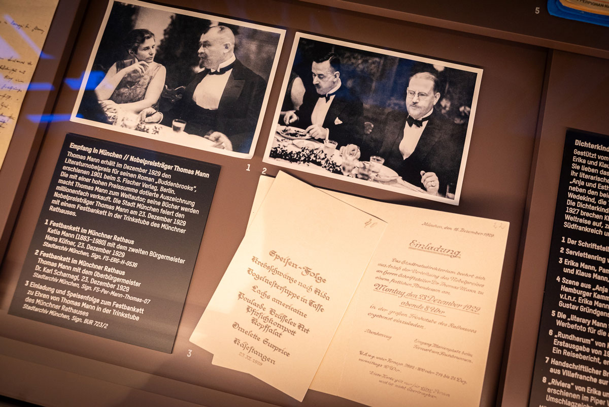Das Zentrum der Avantgarde liegt zu der Zeit in der Hauptstadt Berlin. Auch wenn die Geschwister Mann ihre Abenteuer durch journalistische Artikel und Bücher (ausgestellt: Das Buch von der Riviera) zu finanzieren versuchen, reichen die finanziellen Mittel nicht ganz. Da ist es gut, dass Thomas Mann 1929 den langersehnten Nobelpreis für Literatur für Buddenbrooks erhält. Damit einher geht eine stattliche Geldsumme, mit der der Gewinner die Schulden seiner Kinder begleicht und sich ein Auto gönnt. Eine Fotografie zeigt Thomas Mann bei der Feier ihm zu Ehren im Münchner Rathaus.
