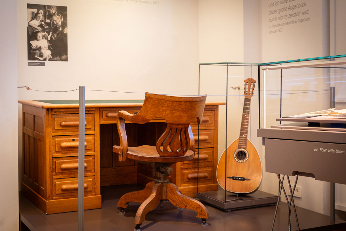 Josef Ruederer, Hanns von Gumppenberg, Marc Henry, der Grafiker Ernst Stern und die Sängerin Marya Delvard. Die Vision eines solchen Kabaretts bringt er aus Paris mit, wo er einige Zeit verbracht hat. Wie bei seinen Dramen tritt Wedekind auch persönlich auf und feiert Triumphe mit seinen freizügigen Liedern, die er zur Gitarre vorträgt. Die Gitarre lehnt in der Ausstellung übrigens neben seinem Schreibtisch.