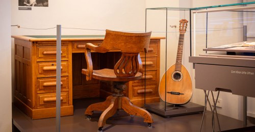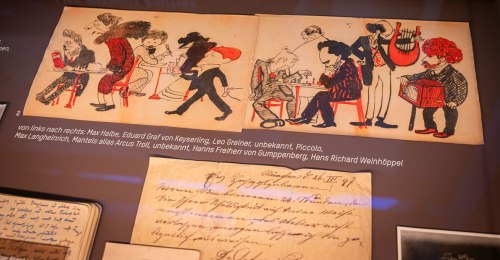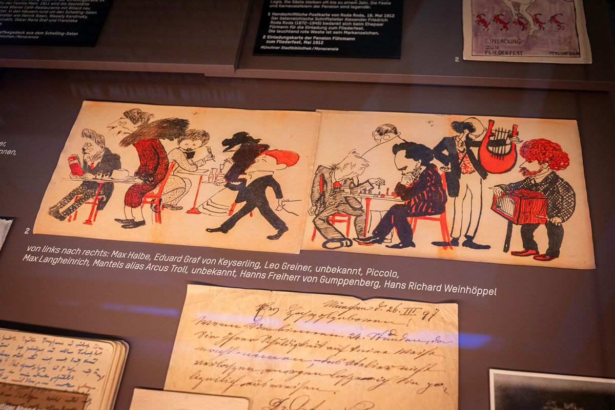 Die Ausstellung beginnt mit dem Dramatiker und Simplicissimus-Mitbegründer Frank Wedekind. Genauer: mit dessen Schreibtisch. Dieser stand in der Wohnung in der Prinzregentenstraße 50, wo Wedekind ab 1906 (