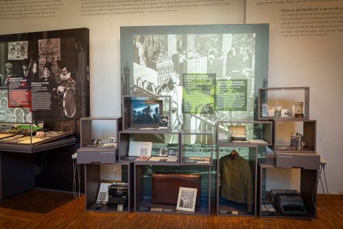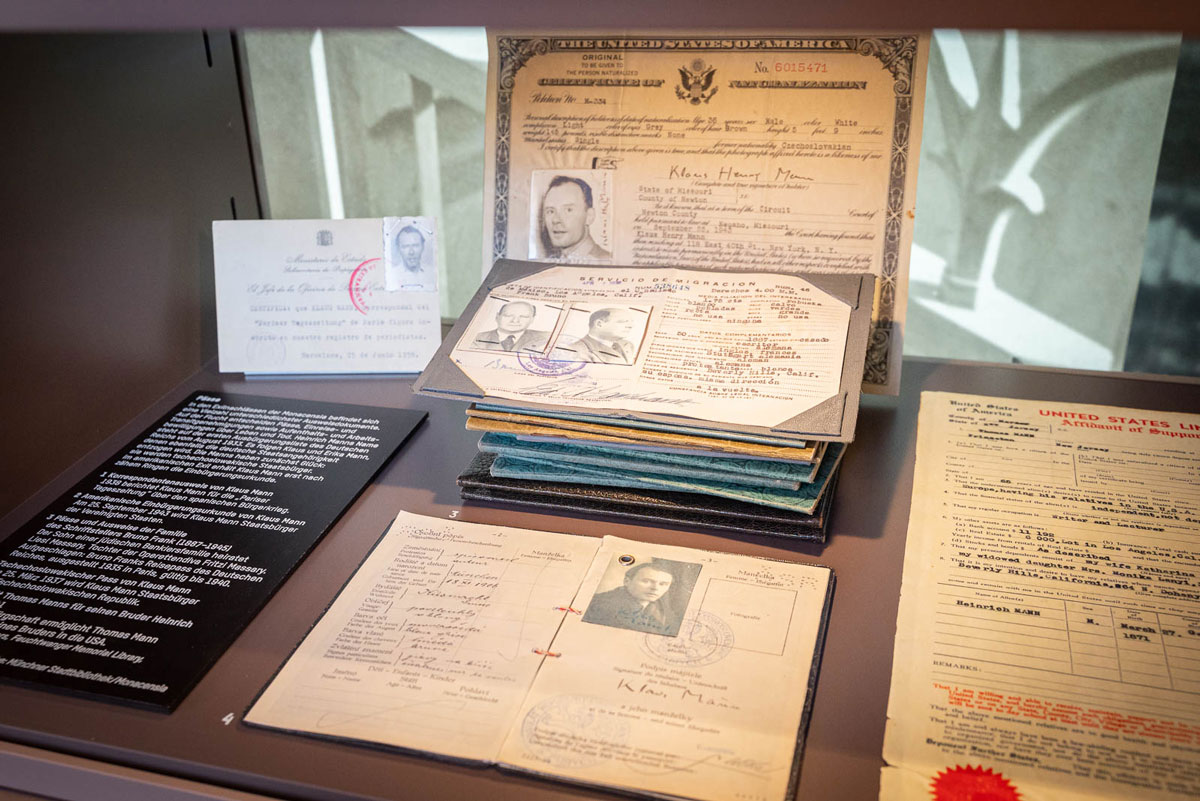 Mit Hitlers Machtübernahme am 30. Januar 1933 beginnt eine große Bedrohung für Intellektuelle, Jüdinnen und Juden sowie Schriftsteller*innen: Sie werden im NS-Staat mit Berufsverboten belegt, verfolgt, mit dem Tod bedroht und auch ermordet. Viele von ihnen versuchen zu flüchten – zunächst in die europäischen Nachbarstaaten, dann oft weiter in die USA. Der Erwerb einer Aufenthaltsgenehmigung ist meist schwierig. Die Antragsteller*innen benötigen Kontakte und Beziehungen, um Pässe, Transite und weitere Genehmigungen zu erhalten. Für viele Schriftsteller*innen bedeutet das Exil neben dem Verlust der Heimat auch den der Sprache. Diese diffizile Situation zeigt die Ausstellung exemplarisch an den Einzelschicksalen von Monika, Erika und Klaus Mann sowie von Annette Kolb, Max Mohr, Grete Weil.