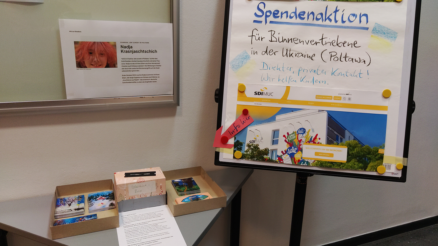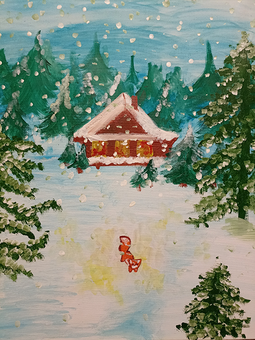 Anlässlich des Weihnachtsfestes veranstaltet die NGO „VPO Ukrainy“ (Anm. d. Ü.: die Vereinigung der Vertriebenen der Ukraine) in der Region Poltawa einen Kinder-Zeichenwettbewerb unter dem Motto „Schenke den Soldaten ein Weihnachtsmärchen.“ Nadia hat eine Krippe gemalt. Anstelle der Heiligen Drei Könige hat sie Soldaten gemalt. Es sind fünf Heilige Drei Könige. Zwei von ihnen haben weiße Flügel, drei haben keine. Dabei sind zwei weiße Hunde, die nicht wie Patron (Anm. d. Ü.: der Hund des Autors) aussehen. Eine erschöpfte Madonna in einem gelben Kleid und einem blauen Umhang. Das Kind, Jesus, schläft.