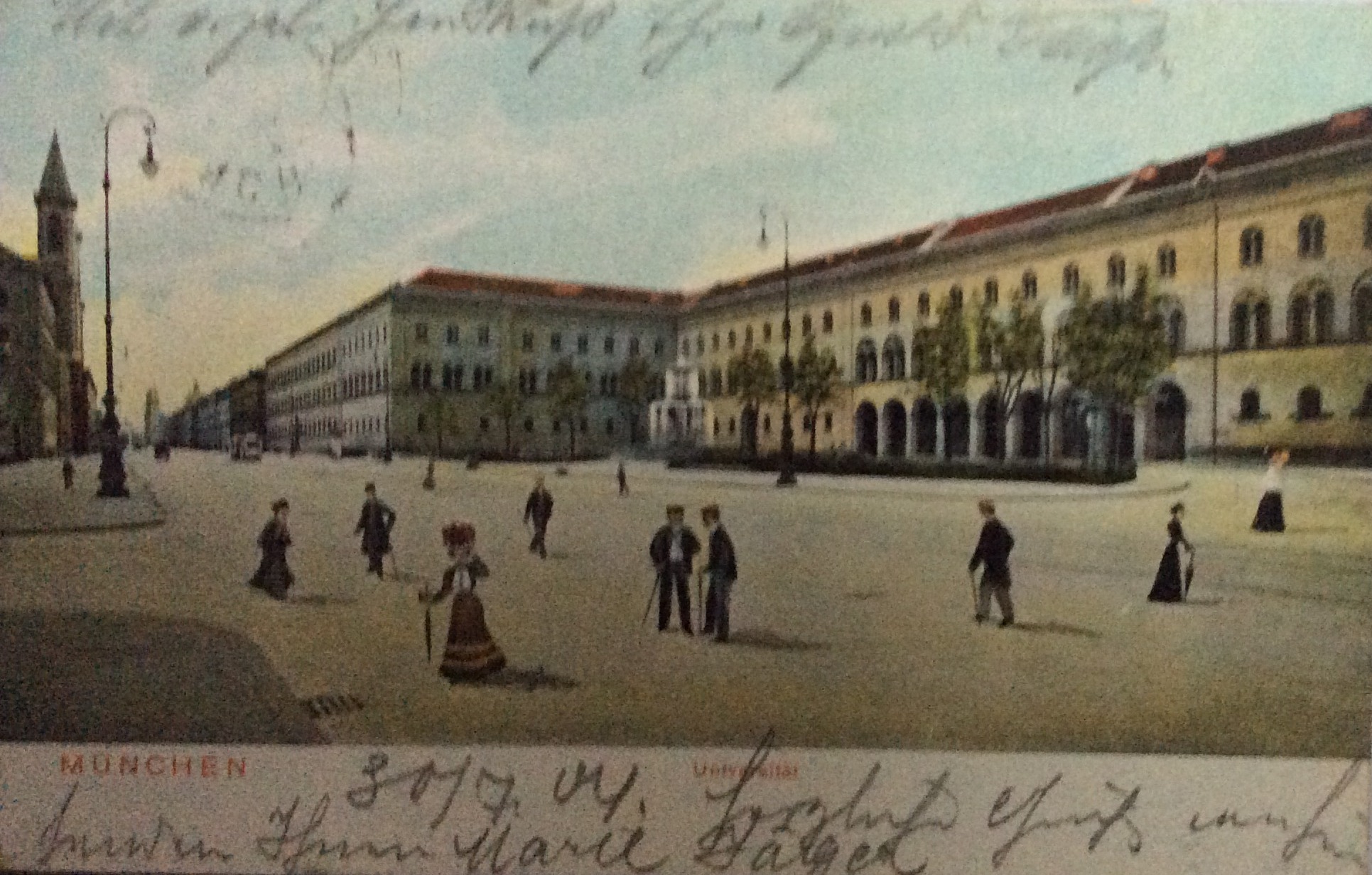 [6] Die beiden Springbrunnen vor der Universität, München. Entwurf Friedrich von Gärtner, 1840-1844. Ansichtskarte, Farbdruck, Poststempel [18]99, Kunstanstalt O. Missler Berlin S, Karten-Nr. 699.