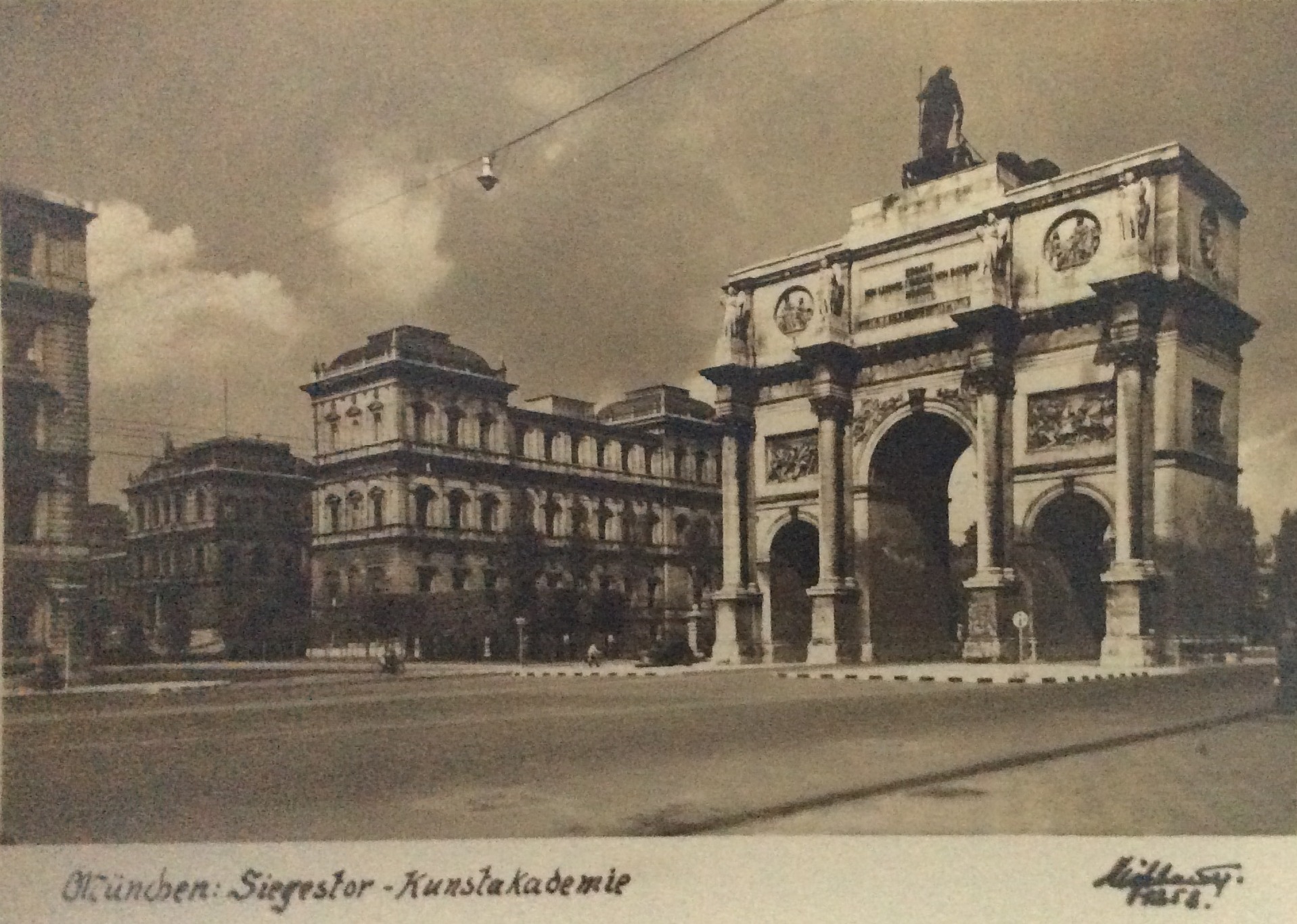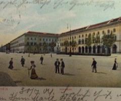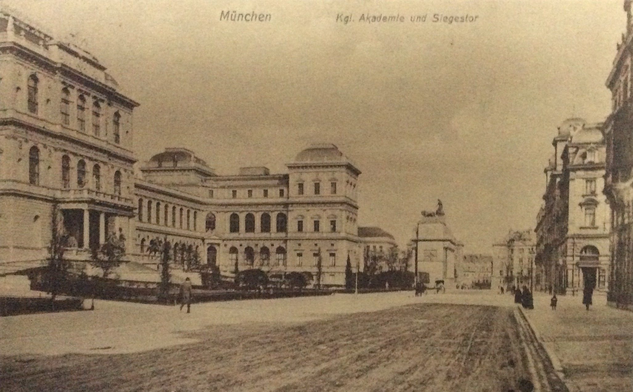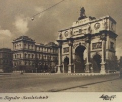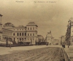 Gemeint bei den Zeitschriften sind auf jeden Fall die Jugend und Simplicissmus, vielleicht auch Die Insel und Avalun, alle in München herausgegeben. Es geht jetzt weiter stadtauswärts: „Vor der Akademie der bildenden Künste, die ihre weißen Arme zwischen der Türkenstraße und dem Siegesthor ausbreitet [Abb. 16, 17 u. 18], hält eine Hofkarosse. Und auf der Höhe der Rampe stehen, sitzen und lagern in farbigen Gruppen die Modelle, pittoreske Greise, Kinder und Frauen in der Tracht der Albaner Berge“ (Abb. 19).