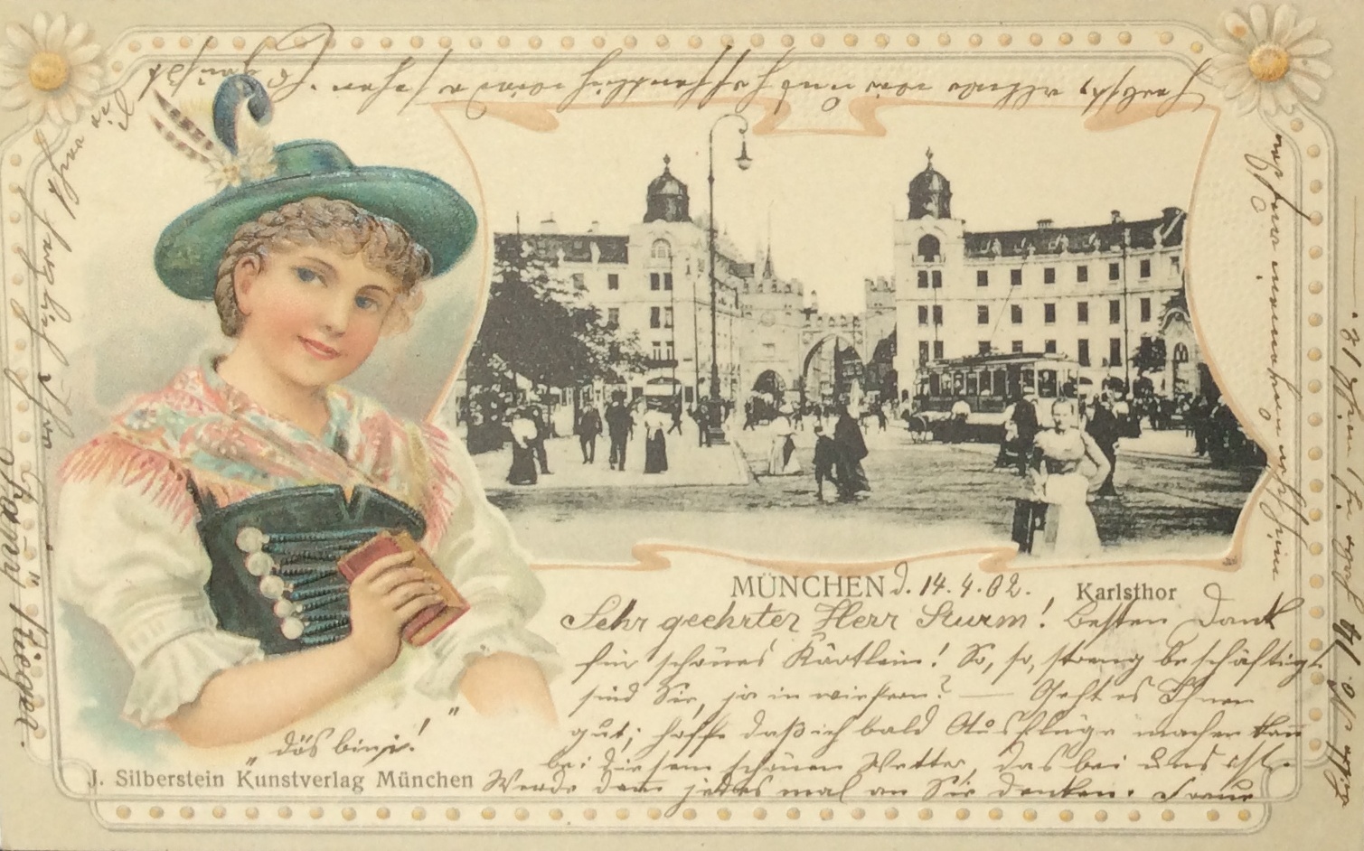 „Junge Künstler“, wohl an der Akademie eingeschrieben und als Inbegriff des lockeren Schwabinger Lebens gedacht, tauchen im fünften Absatz der Novelle auf und „sehen den kleinen Mädchen nach, diesem hübschen, untersetzten Typus mit den brünetten Haarbandeaux, den etwas zu großen Füßen und den unbedenklichen Sitten …“. Diese Beschreibung der katholischen Münchener Mädchen wird in den folgenden Seiten mehrfach wie ein Leitmotiv von Mann wiederholt, möglicherweise als distanzierter Zugereister und evangelisches Lübecker Kind, um nachhaltig auf die Unterschiede zu den oft blonden, langbeinigen norddeutschen oder englischen Mädchen zu verweisen. Es kann auch sein, dass die Beschreibung gleichzeitig auf Florentiner Mädchen passen soll. Aber siehe da, es gab tatsächlich eine Münchener Ansichtskarte, etwa aus dem Jahre 1902, die eben ein solch gesittetes und fröhliches Münchener Mädchen mit Haarbandeaux zeigt, das als Zeichen ihrer unbedenklichen Sitten als Werbefigur für München tatsächlich ein Gebetbuch in der Hand trägt! (Abb. 22)