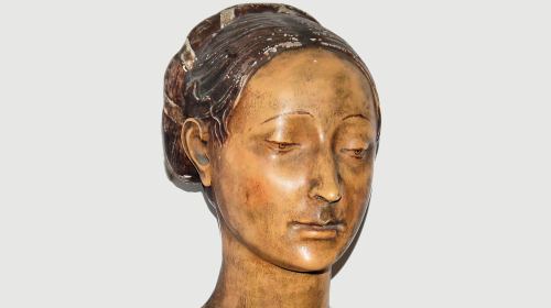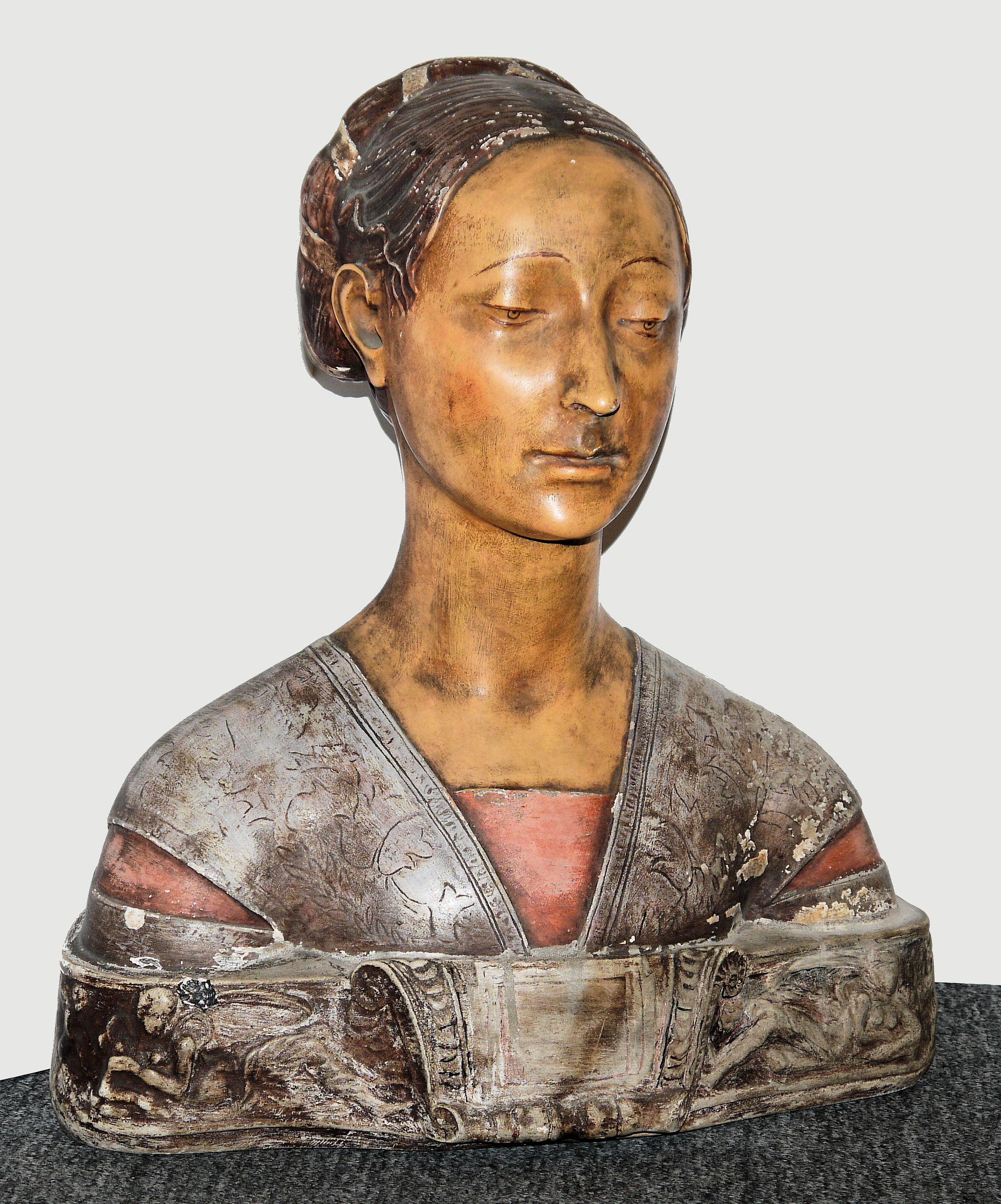 Die Büste trägt eine französische Bezeichnung, weil das Original im Louvre in Paris stand, in dem sie als Werk von Mino da Fiesole angesehen wurde: Die Marmorbüste ist jedoch nach späteren Erkenntnissen ein Werk des zu dieser Zeit in Sizilien arbeitenden, dalmatinischen Bildhauers Francesco Laurana (1430-1502) aus dem Jahre 1468. Die Büste wurde um 1900 von mehreren Gipsgießereien reproduziert, darunter passenderweise von einem Unternehmen, der Hofkunstanstalt Fritz Kochendörfer, dessen Inhaber Bildhauerei u.a. an der Münchener Kunstakademie studiert hatte (Abb. 27). Dieser in Mannheim geborene, in Sonneberg in Thüringen aufgewachsene Bildhauer hatte in Rom und Florenz in Marmor gearbeitet und sich 1899, nach einigen Jahren in Osterode am Harz bei der Kunstanstalt Schumacher & Co., in Sonneberg mit zeitweilig über hundert Mitarbeitern selbstständig gemacht [12]. Es ist also denkbar, dass es sich zum Teil auch um Kochendörfer-Büsten handelte, die dem Betrachter aus den Schaufenstern der großen, wie auch „kleinen Skulptur-, Rahmen- und Antiquitätenhandlungen“ in München entgegenschauten.