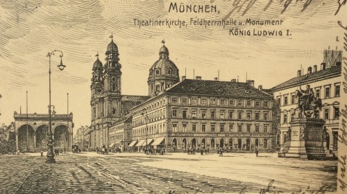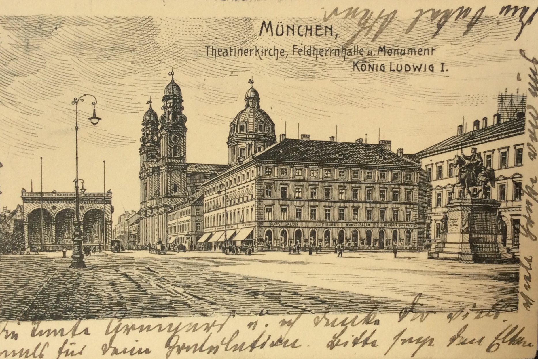 Mit dem Gebrauch der ausschließlich italienischen Bezeichnung für Gärtners Bau, die der Autor anschließend mehrfach wiederholt, befinden wir uns hier am Odeonsplatz gleichzeitig in der Parallelwelt von Florenz. Ein Schnitt zurück nach München folgt sogleich: Die Leute drängen sich „um die breiten Fenster und Schaukästen des großen Kunstmagazins, des weitläufigen Schönheitsgeschäftes von M. Blüthenzweig“. An der linken Ecke Ludwigstraße/Odeonsplatz befand sich unter der Adresse Odeonsplatz 2 tatsächlich der „Kunst-Salon J. Littauer“, auf den wir noch ausführlich zurückkommen werden: Bei dieser ersten Erwähnung des Geschäftes muss man auf den Verschleierungsversuch des Autors achten, der beim Hinweis auf dieses Geschäft gleichzeitig von ihm ablenkt: Die Fenster sind nämlich keineswegs „breit“, sondern schmal und hoch und diese Fensterform wird noch eine Rolle bei den darin zu sehenden Bildern zu spielen haben. Soweit bekannt, existieren keine zufriedenstellenden Fotos des Äußeren des Kunst-Salons, die das Gebäude von Nahem zeigen. Immerhin gibt eine schwarzweiße Ansichtskarte aus der Zeit um 1904 einen guten Eindruck des Eckgeschäftes, wie ihm Thomas Mann bekannt gewesen sein dürfte (Abb. 30).