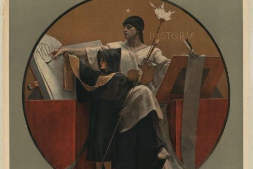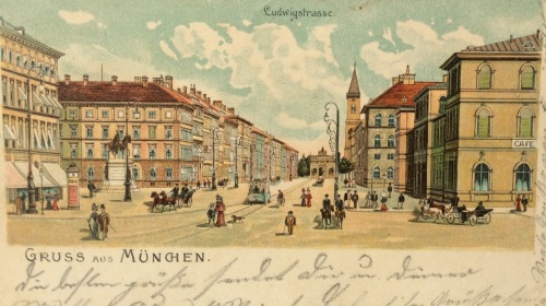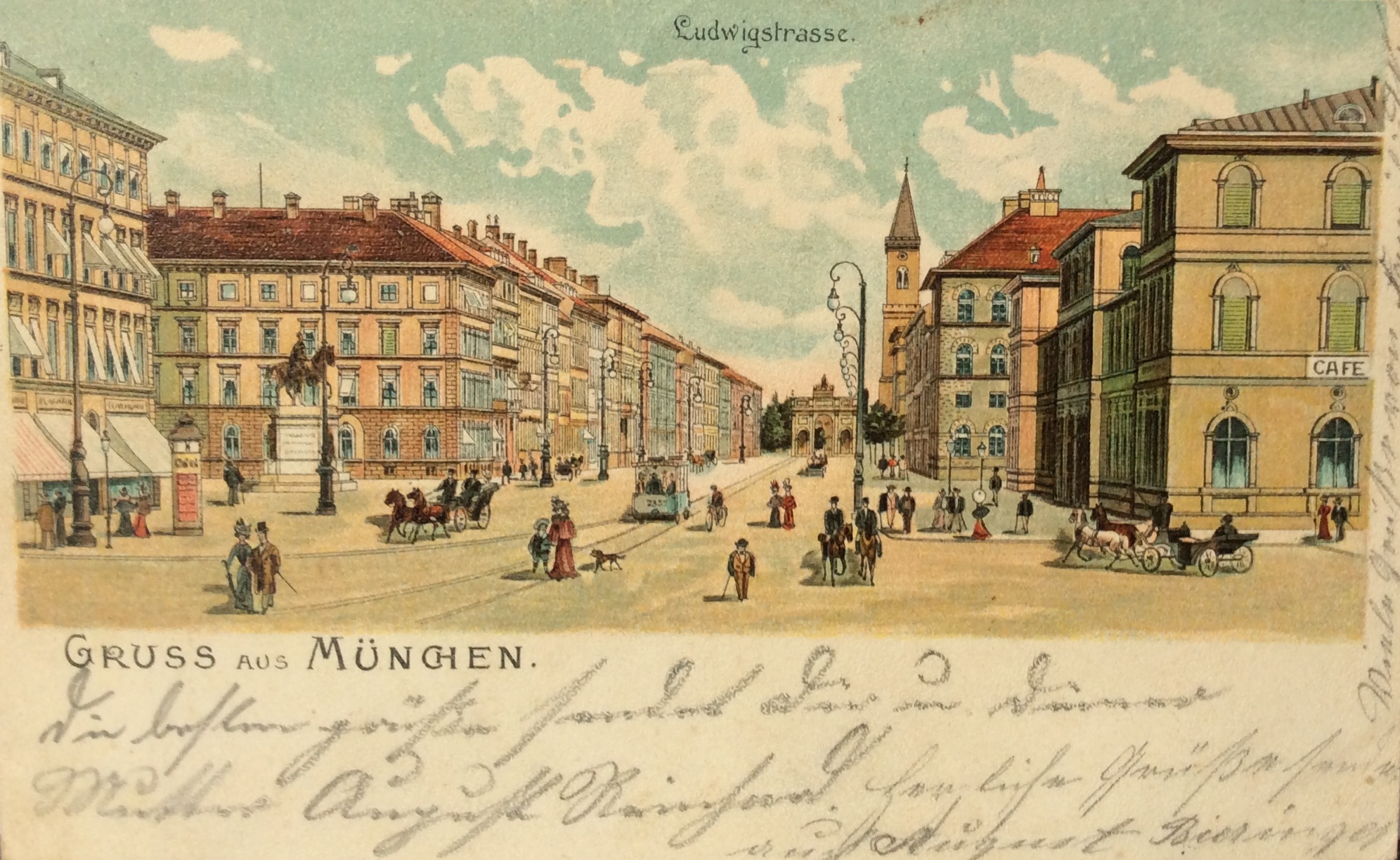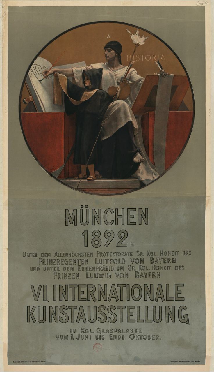 Wir stehen ganz gewiss auch vor der Auslage von J. Littauer, denn zu den von Mann erwähnten „Litfaßsäulen“ gehörte ein Exemplar, das unweit des Kunst-Salons in der Ludwigstraße stand. Auf einer zeitgenössischen Ansichtskarte ist unter der Lupe das Plakat des griechischen Akademieprofessors Nikolaus Gysis (1842-1901) zu erkennen, das in „archaisierender“ oder klassisch-antiker Art die Figur einer im Künstleratelier sitzenden Frau zeigt: Sie ist die Personifikation der „Historia“, die gerade das Wort „Artibus“ mit Unterstützung des mit Kapuze ausgestatteten Münchner Kindls, das die Hand der Historia führt, in einem Folioband schreibt (Abb. 46).