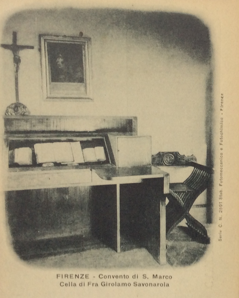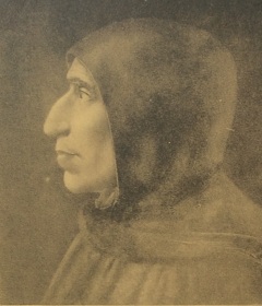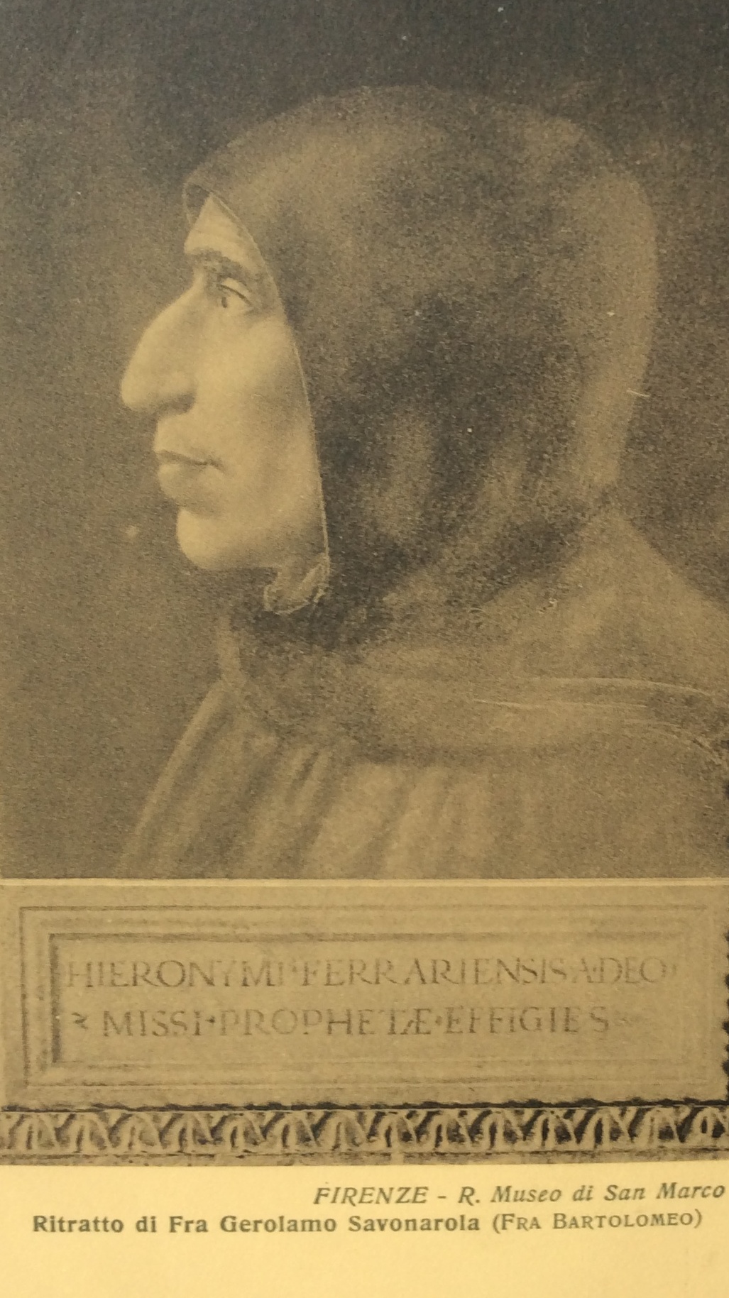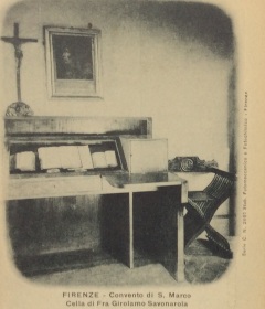 Es ist dann Savonarola, eindringlichere Teil der Doppel-, wenn nicht gar Dreifachgestalt, der, „seines gewaltsamen Schicksals bewusst, die so aussah, „als ob ein Schatten über die Sonne ginge oder über das Gemüt eine Erinnerung an schwere Stunden“, die Rolle des Hinanschreitenden übernimmt. Thomas Mann beschreibt seine Hauptfigur in treffender Weise in einem Brief an Otto Grautoff, der sich gerade in Florenz aufhielt, vom 6. November 1901: „Dich grüßt die bunte Herrlichkeit des Doms, die verführerischen Wunder der Uffizien, des Bargello und des Palazzo Pitti sind Dein, und von San Marco zum Signorenpalast führt Dich, wie einst meinen düsteren Helden, die schöne Straße …“ [30]. „Im Profil gesehen“, heißt es weiter im Text der Novelle, „glich dieses Gesicht genau einem alten Bildnis von Möncheshand, aufbewahrt zu Florenz in einer engen und harten Klosterzelle, aus welcher einstmals ein furchtbarer und niederschmetternder Protest gegen das Leben und seinen Triumph erging …“. Nun erscheint Savonarola leibhaftig auf der Schellingstraße vor dem Leser in Form des kleinen Bildnisses, gemalt von Fra Bartolommeo (1472-1517), einem seiner treuesten Anhänger und ebenfalls im Kloster San Marco lebend, das um 1900 in Savonarolas Zelle in San Marco hing (Abb. 54 u. 55). Mit den letzten Worten des Absatzes wird das Schicksal des Mönches als fanatischer Kämpfer „gegen das Leben und seinen Triumph“ angedeutet.