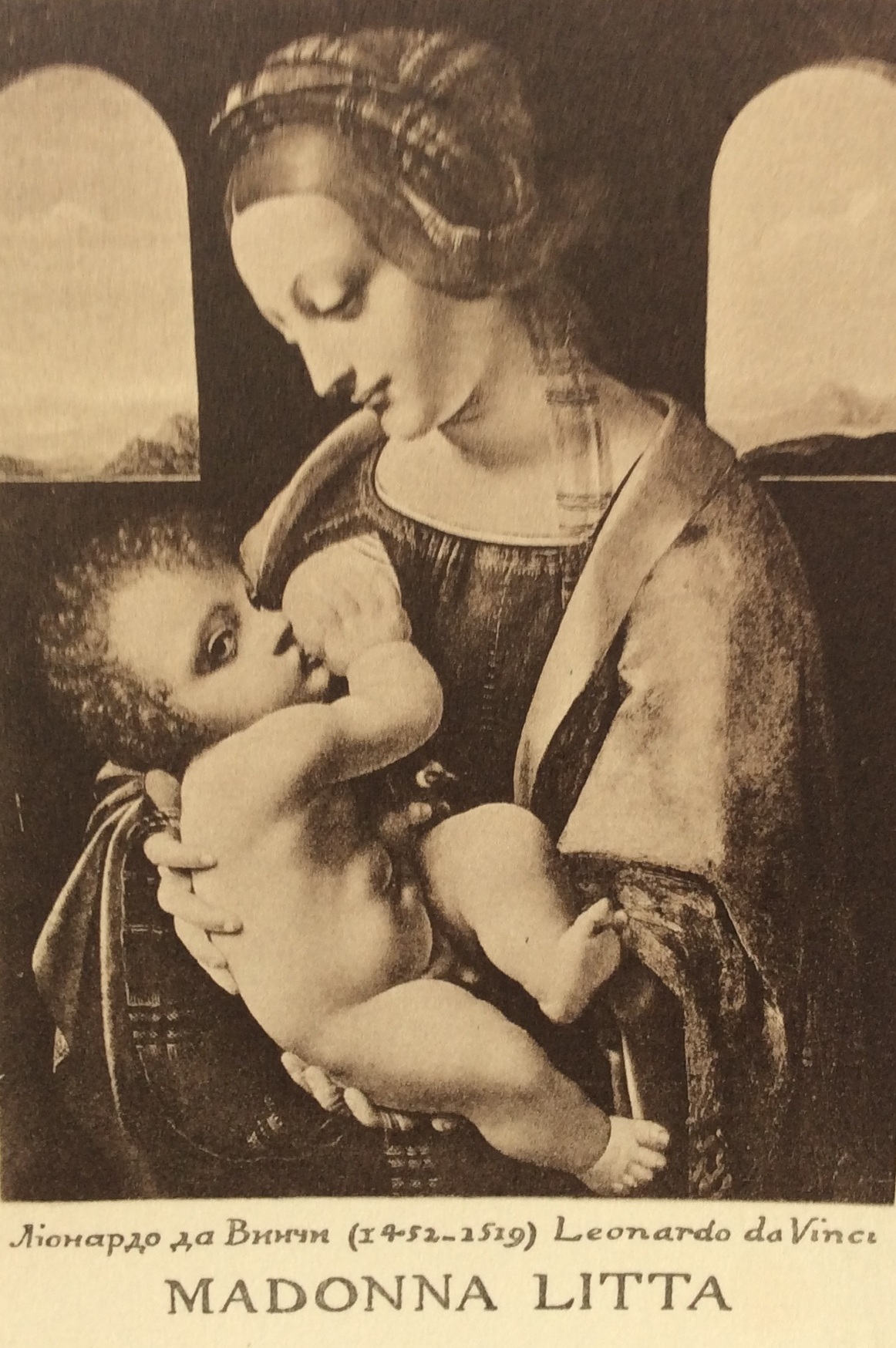 „Die heilige Gebärerin“ kann nur eine Madonna der Renaissance darstellen: entblößt und schön kann sie schon sein, aber umso weniger passen ihre „großen, schwülen Augen“, die „dunkel umrändert“ waren, noch „ihre halb geöffneten, delikat und seltsam lächelnden Lippen“ zu einer Darstellung einer Madonna mit Kind aus dem 15. Jahrhundert. Hier wird eine „heilige Gebärerin“ und gleichzeitig ihr Gegenpol, eine übergelagerte Frauengestalt von krankhafter Erscheinung beschrieben, deren Moral durch ihre körperliche Erscheinung in Zweifel gezogen wird. Es liegt also ein modernes Bild über dem Renaissance-Bild, die Bilder verschmelzen und werden als Einzelbilder, als Doppelgestalt, nicht auseinanderzuhalten sein. Diese schon erwähnte Doppelschichtigkeit der Objekte sowie der Hauptfigur Hieronymus/Savonarola entspricht also dem zweischichtigen Aussehen des Bildes, das gewiss für Savonarola, aber vielleicht auch, wie wir sehen werden, für den deutschen Jüngling Hieronymus von Bedeutung sein wird: Beide Teile der Doppelgestalt können abweichende Bilder erkennen. Die folgenden Zeilen heben den Renaissance-Charakter des Bildes hervor, der Herkunft Savonarolas entsprechend, und dadurch kommt die Identifizierung des Bildes ein Stück näher: „Ihre schmalen, ein wenig nervös und krampfhaft gruppierten Finger umfaßten die Hüfte des Kindes, eines nackten Knaben von distinguierter und fast primitiver Schlankheit, der mit ihrer Brust spielte und dabei seine Augen mit einem klugen Seitenblick auf den Beschauer gerichtet hielt“. Es gibt nun nur ein einziges Bild in der gesamten Malerei der italienischen Frührenaissance, das dieser Beschreibung entspricht und das den Beschauer zum wissenden Komplizen machen könnte, nämlich La Madonna Litta, eine Madonna lactans, um 1490-1495 zur gleichen Zeit von Savonarolas Wirken in Florenz gemalt. Gegen Ende des 19. Jahrhunderts wurde das Bild noch dem Florentinischen Maler Leonardo da Vinci (1452-1519) zugeschrieben. Es befand sich seit 1865 als Erwerbung aus der Sammlung des Conte Litta in Mailand in der Ermitage in Sankt Petersburg: Dort wird die traditionelle Zuschreibung an Leonardo aufrechterhalten, westliche Kunsthistoriker neigen jedoch zu einer Zuschreibung an Leonardos aus Mailand stammenden Schüler Giovanni Antonio Boltraffio (1467-1516).