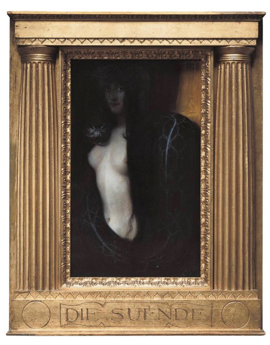 [49] Die Maße der „Hanfstaengl-Sünde“ sind unbekannt, ebenso ihr heutiger Standort. Es ist die einzige Version mit doppelt gewundener Schlange auf dem Unterleib der nackten Frau; in späteren Jahren erwarb Hanfstaengl die Rechte an drei weiteren Versionen der „Sünde“: s. Albert Ritthaler. Franz von Stuck und seine Sünden, Vortrag anlässlich der Ausstellung „Künstlerfürsten: Liebermann, Lenbach, Stuck“, Stiftung Brandenburger Tor, am 8. Juni 2009 im Max Liebermann Haus, Berlin, o. S.;