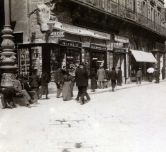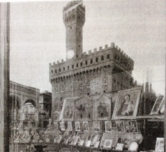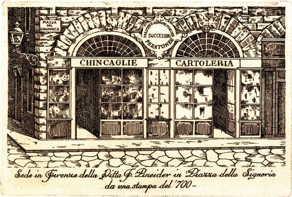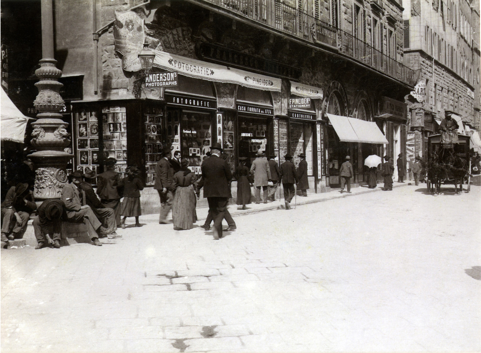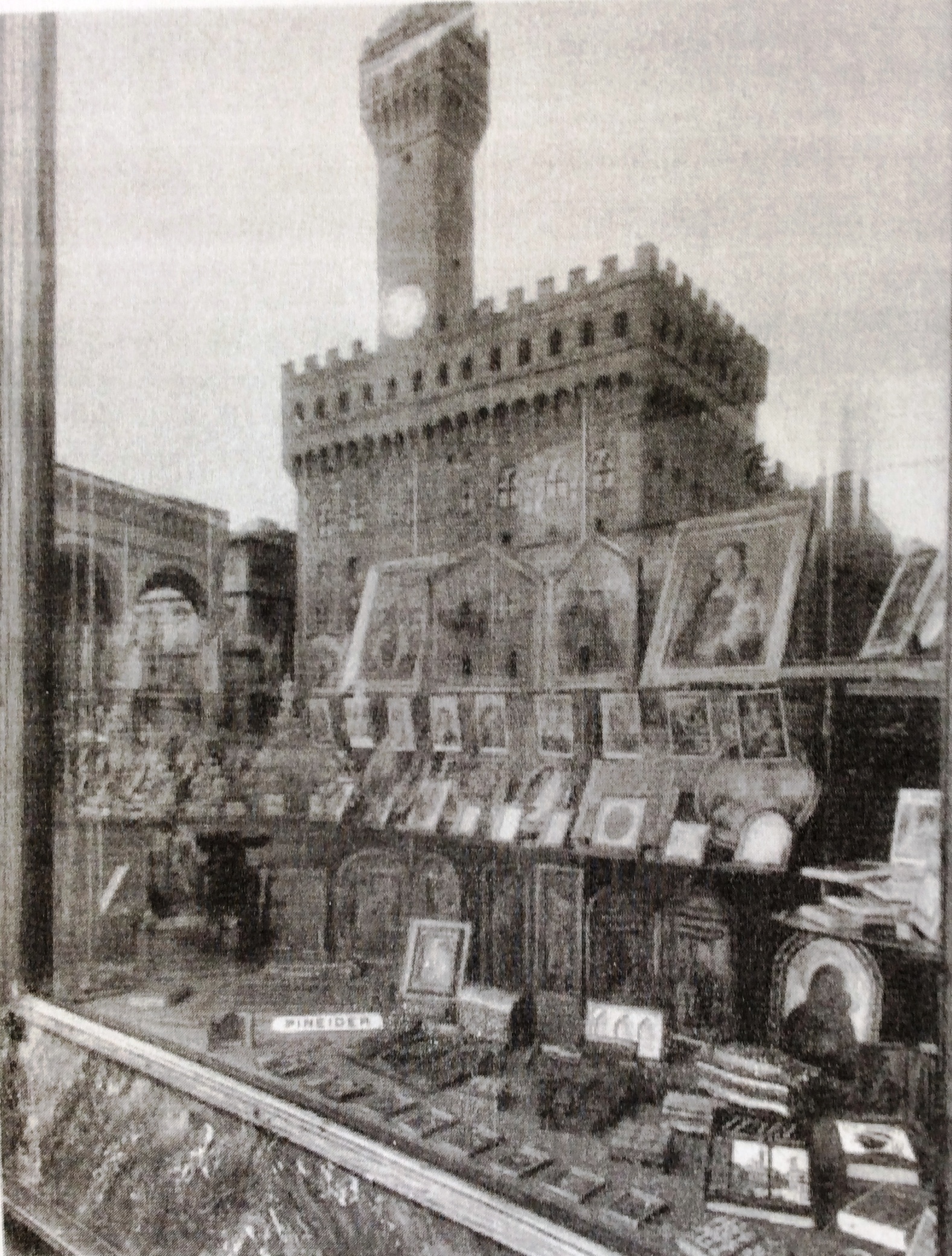 Auf der Ansichtskarte, Abb. 74, ist In der Auslage von Pineider ganz deutlich eine Madonna mit Kind, eine gerahmte Reproduktion nach einem Bild von Raphael, zu erkennen, und auch sonst nimmt man ein breites Angebot an Kopien in kleineren und größeren Formaten wahr, die als Andenken für die Besucher aus aller Welt bestimmt sind. Francesco Pineider stammte aus Val Gardena in den Dolomiten und wurde in Florenz zunächst für die Herstellung von Luxuspapieren, dann für Galanteriewaren der höchsten Qualität, besonders für den Gebrauch am Schreibtisch berühmt. Eine Anzeige der Firma aus dem Jahre 1900 zeigt, dass das Angebot sich über die Jahre erweitert hatte [62]: Man nennt sich nun „Grand Photograph Stores“ – eine Filiale bestand in der Via Cerretani am Dom – mit einer „Great Collection of views, architecture, edifices, statuary, and pictures in Florence and the most important cities in Italy“. Dazu kommen „Platinum and Carbon Photographs – Executed also in large size“, auch „Artistic Chromos and Prints“, sowie „Carved Walnut in Florentine Frames“ bereichern das Angebot [63].